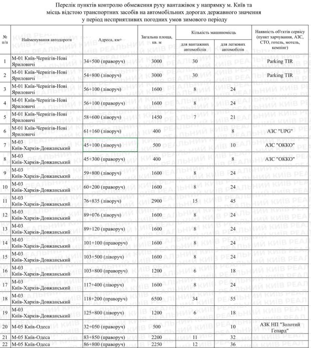 спеціальні місця відстою транспорту на дорогах державного значення навколо Києва.