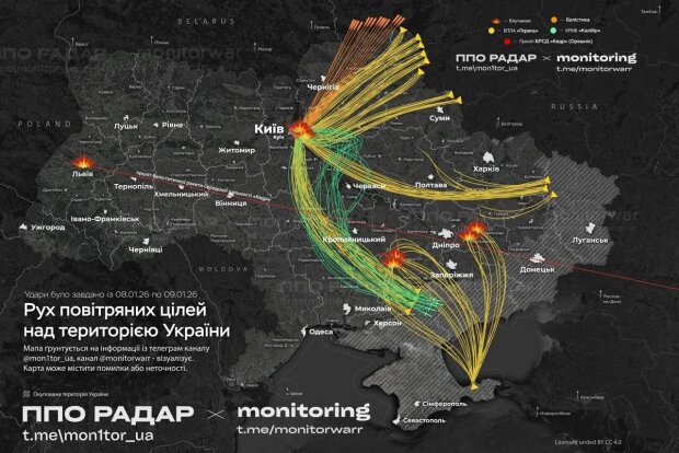 У ніч на 9 січня (з 19:30 8 січня) противник завдав комбінованого удару по об'єктах критичної інфраструктури України із застосуванням ударних БпЛА, ракет морського та наземного базування. Про це пише Стіна, посилаючись на матеріал Повітряних Сил ЗС України.
